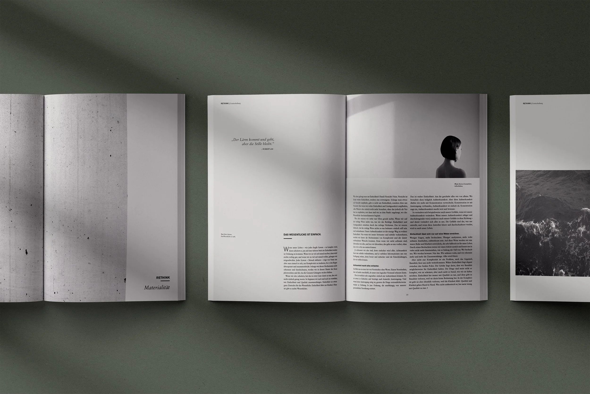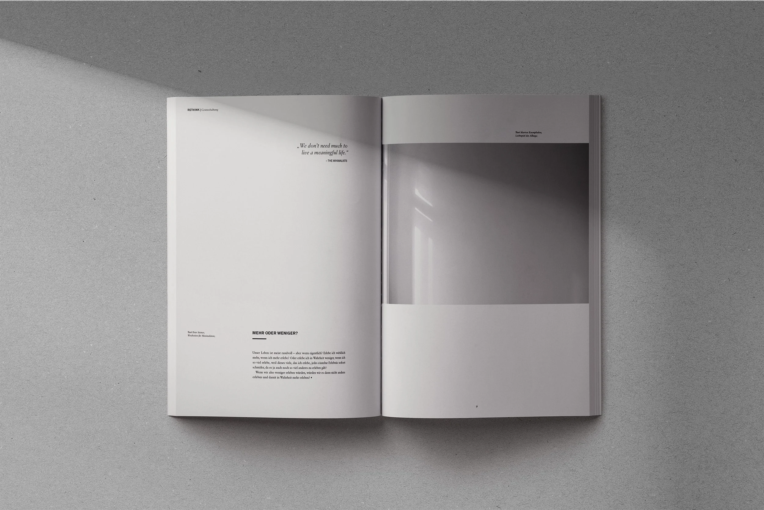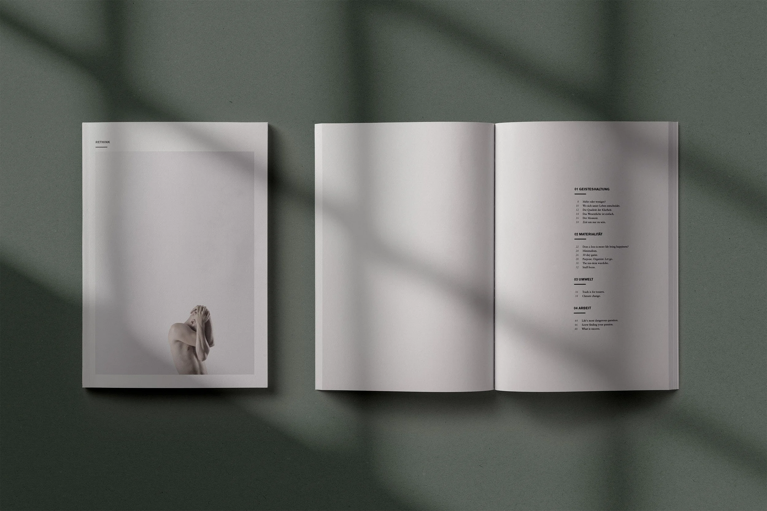 Das Magazin „Rethink“ regt dazu an, alltägliche Muster neu zu überdenken – von Konsum über Arbeit bis Umweltverhalten. Gestaltung, Fotografie und Cover sind bewusst minimalistisch und von großzügigem Weißraum geprägt. Die ruhige Ästhetik spiegelt den Kerngedanken wider: Weg von Überreizung und Überkonsum, hin zu bewusster Reflexion und Leichtigkeit. So wird das Magazin zum stillen Impuls, neue Alternativen im Leben zu erkunden.
