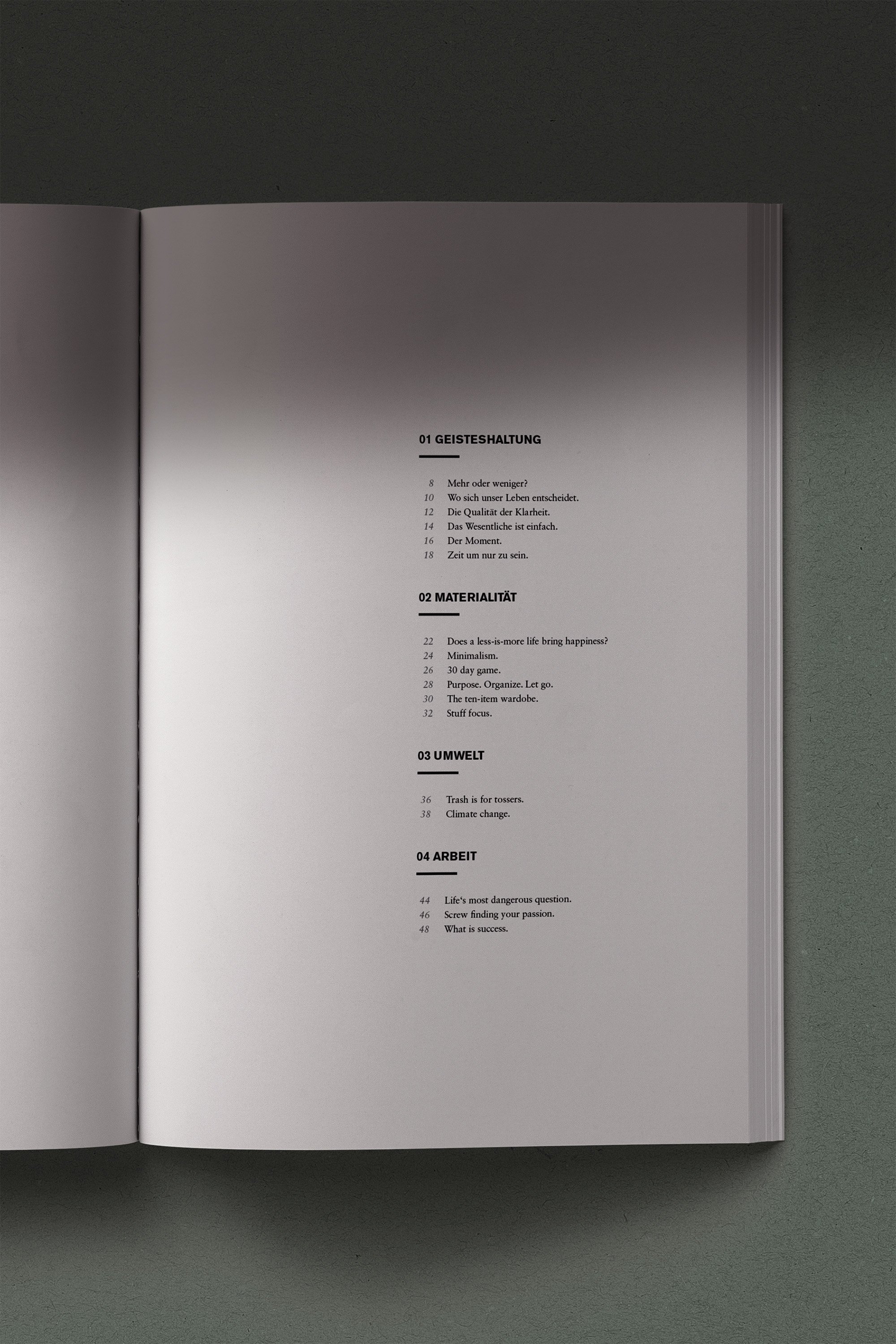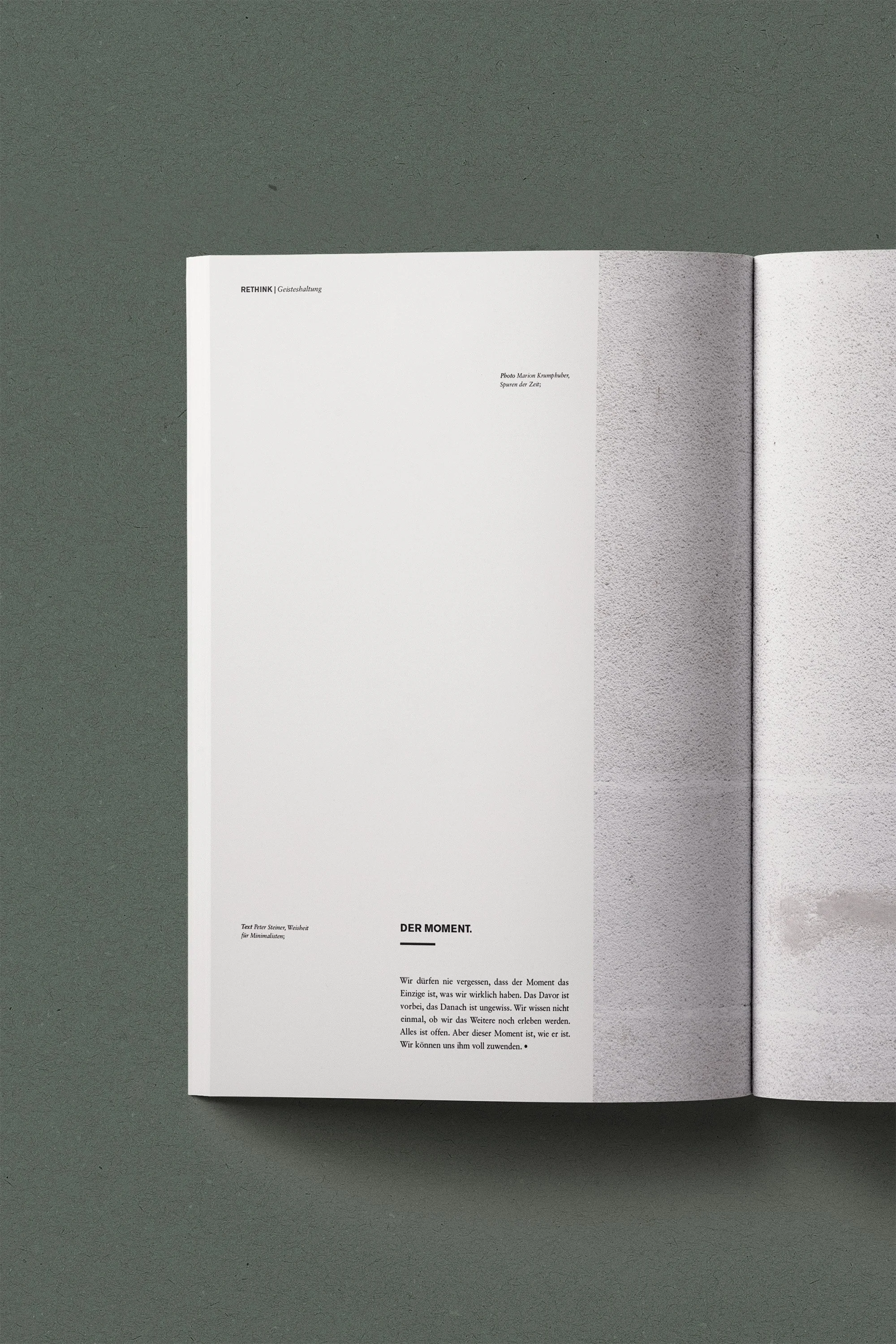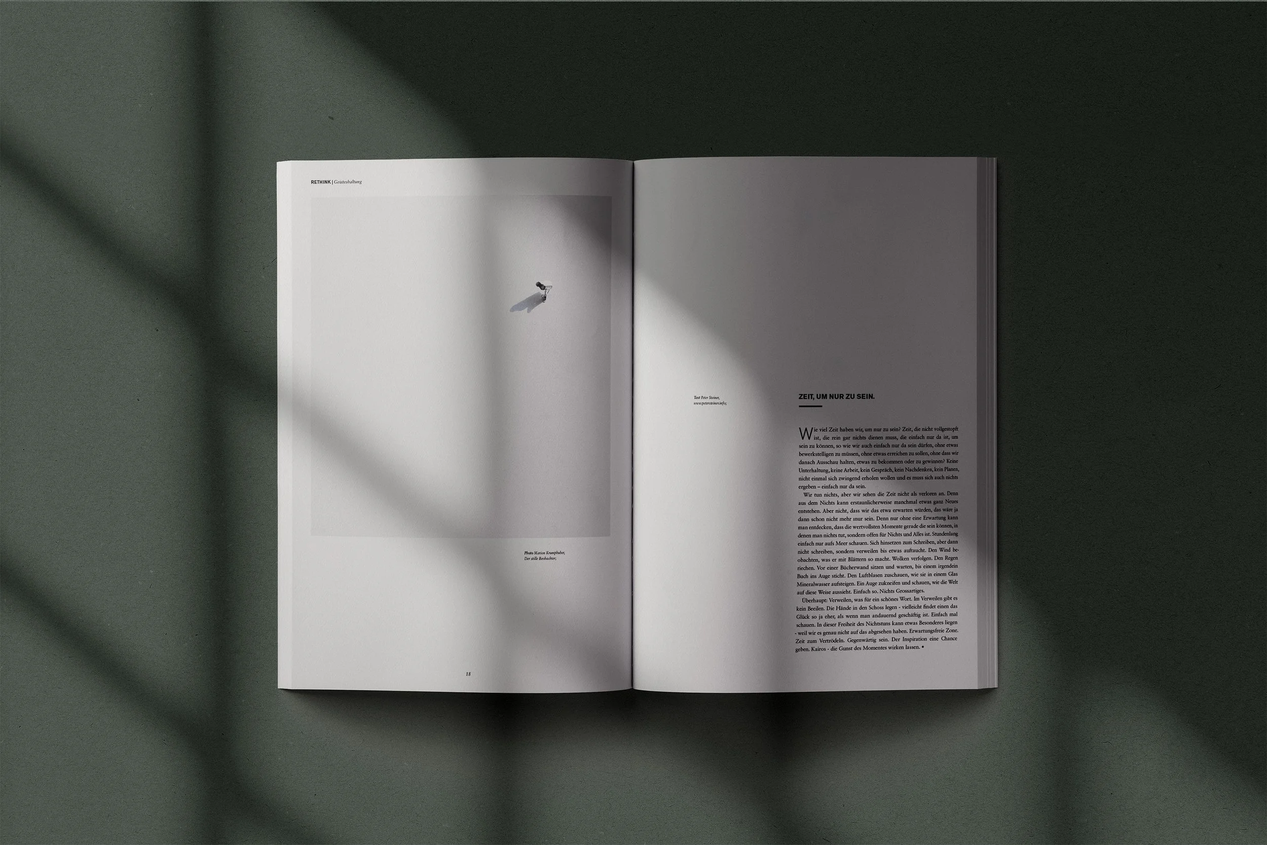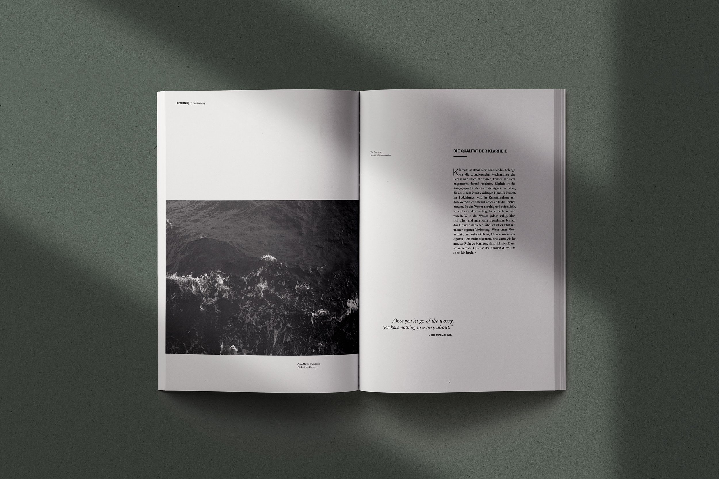 Das Magazin „Rethink“ regt dazu an, alltägliche Muster neu zu überdenken – von Konsum über Arbeit bis Umweltverhalten. Gestaltung, Fotografie und Cover sind bewusst minimalistisch und von großzügigem Weißraum geprägt. Die ruhige Ästhetik spiegelt den Kerngedanken wider: Weg von Überreizung und Überkonsum, hin zu bewusster Reflexion und Leichtigkeit. So wird das Magazin zum stillen Impuls, neue Alternativen im Leben zu erkunden.